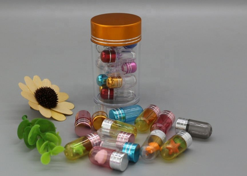 Warna botol mini jelas dan tutup aluminium dalam beberapa warna hoki yang disesuaikan.Mereka berada dalam bentuk yang berbeda seperti silinder/segi delapan/heksagonal/peluru/berlian/berbagai binatang lucu dll.